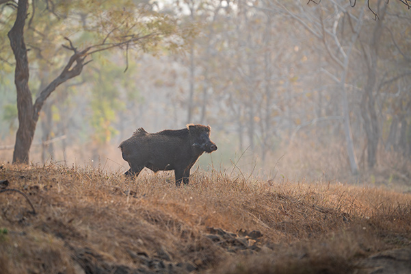 Large wild boars are common, their bodies powerful and bristled, tusks catching the light as they move cautiously through open patches. Skittish yet imposing, they melt into cover with surprising grace when alarmed.