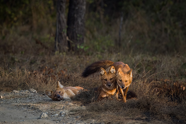 Indian wild dogs are often encountered during their morning ritual walks, a closely bonded group moving with purpose. There is play, scent marking, gentle jostling, and constant communication. Even at rest, their alertness suggests readiness, the hunt never far from thought.